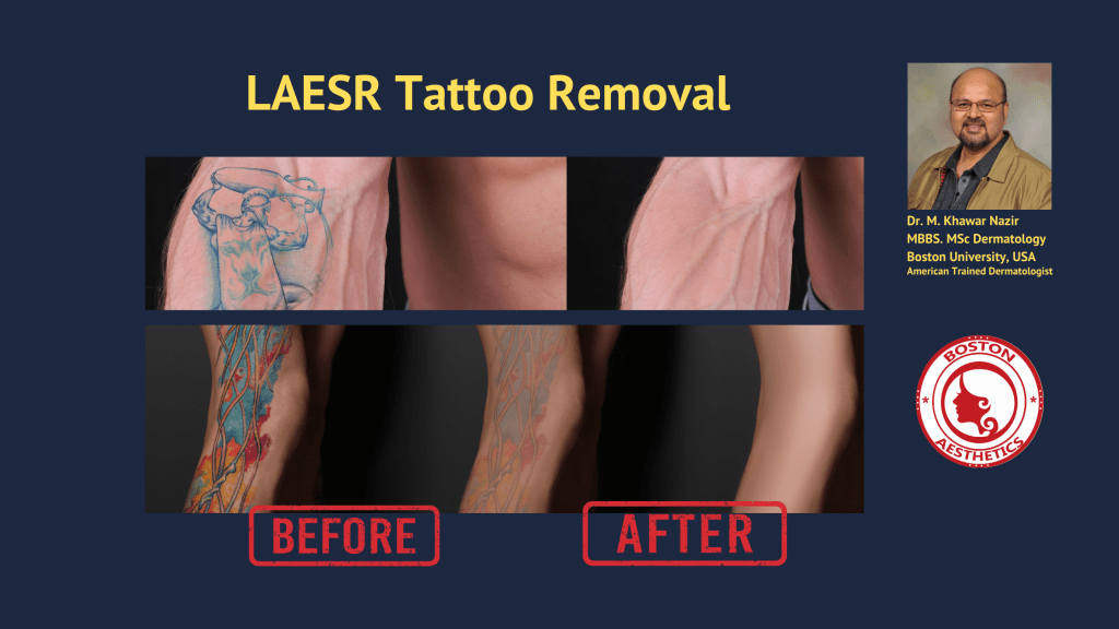 “I had a tattoo that I got on a whim and deeply regretted it later. It became a daily reminder of a decision I wished I hadn’t made. After doing my research, I decided to consult Dr. M. Khawar Nazir at Boston Aesthetics for a laser tattoo removal treatment. The process was meticulously explained to me, and the staff made sure I was comfortable throughout. I couldn’t believe how significantly the tattoo faded after just a few sessions! Now, it’s almost invisible. I couldn’t be happier with the results. Highly recommend Boston Aesthetics for laser tattoo removal!”