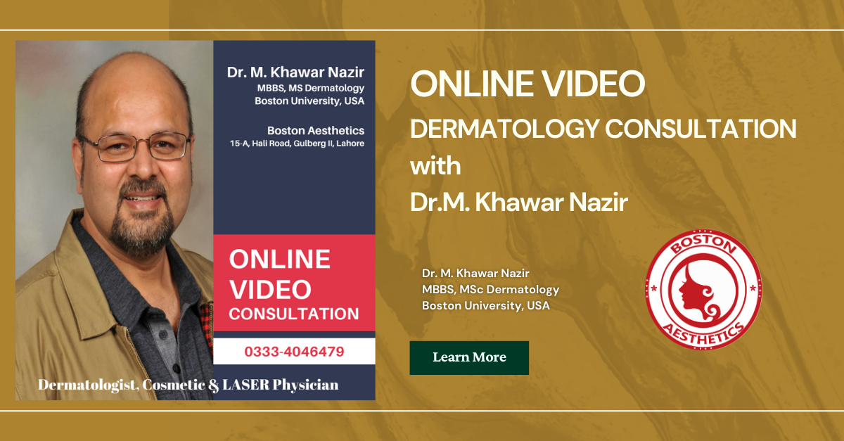 Experience expert online dermatology video consultations with Dr. M. Khawar Nazir at Boston Aesthetics Lahore. Get personalized skin care solutions from the comfort of your home. Contact now: 0333-4046479.